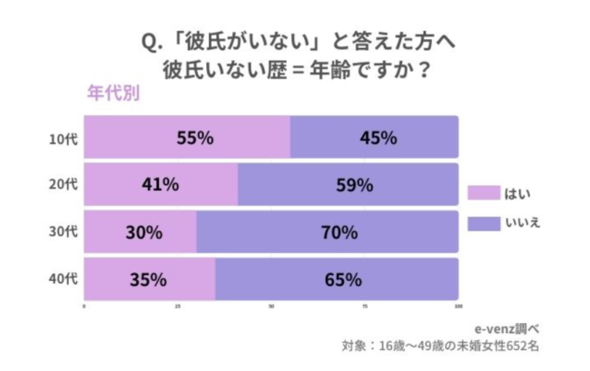 男女の出会いメディアe-venzを運営するノマドマーケティング株式会社が2021年9月に行った調査によると、30代女性の彼氏いない歴=年齢の割合は3割であることが分かりました。