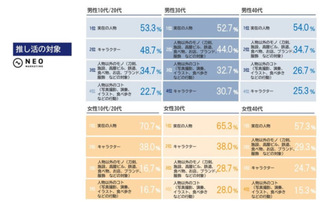 株式会社ネオマーケティングの調査によると、30代女性における推し活対象の6割がアイドルや2.5次元俳優といった実在の人物であることが分かりました。