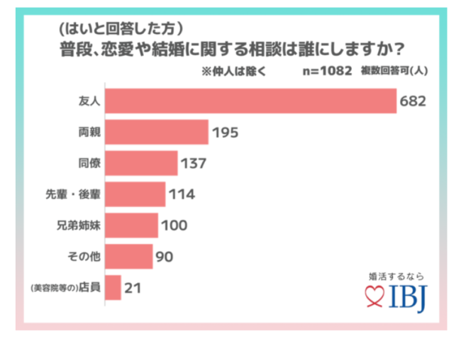 実際に、日本結婚相談所連盟(株式会社IBJ)が登録会員の男女1,875人に調査したところ、6割以上が恋愛や結婚に関する相談を友人にしていることが分かりました。